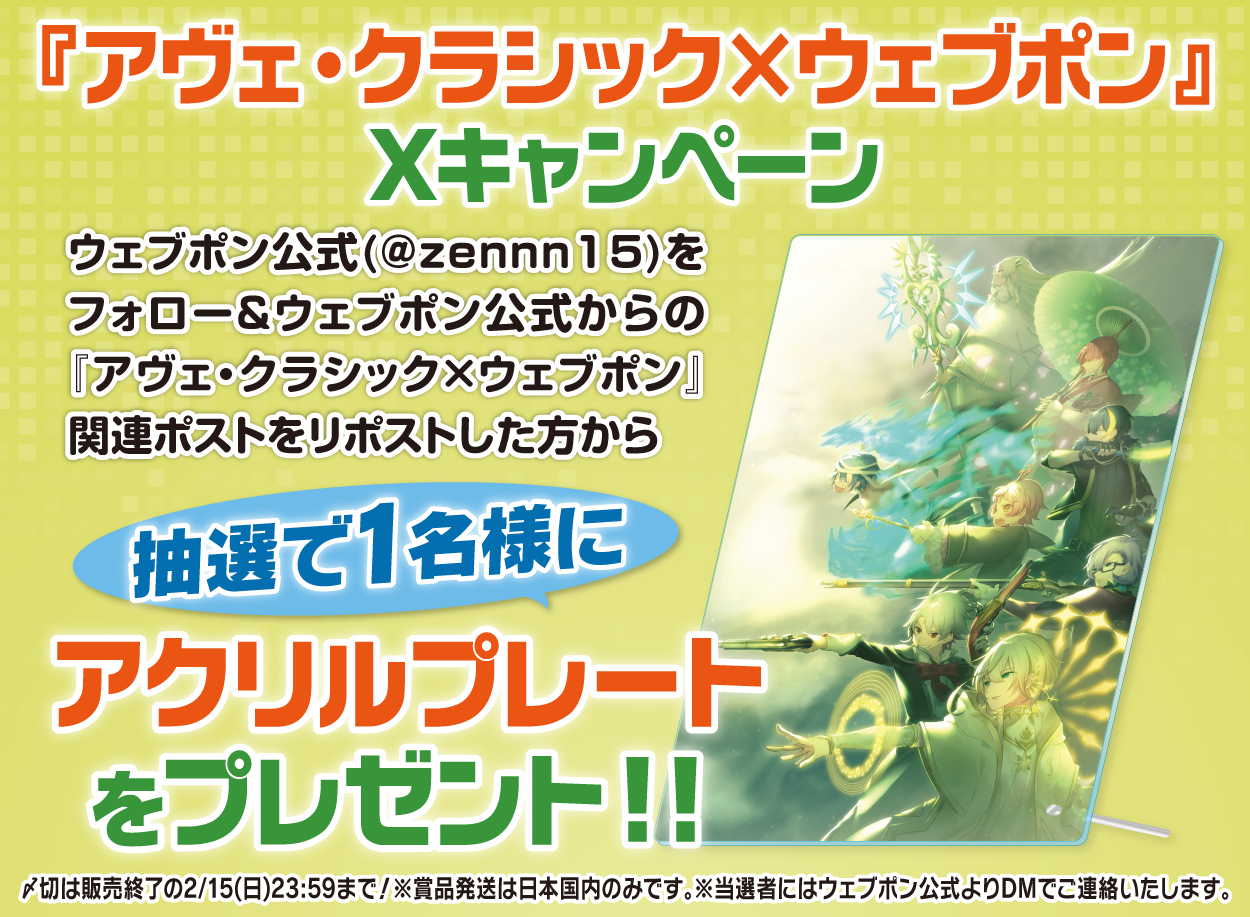 | 備考 | ★『アヴェ・クラシック×ウェブポン』Xキャンペーン★ ウェブポン公式(@zennn15)をフォロー&ウェブポン公式からの『アヴェ・クラシック×ウェブポン』関連ポストをリポストした方から抽選で1名様に【アクリルプレート】をプレゼント!!〆切は販売終了の2/15(日)23:59まで!※賞品発送は日本国内のみです。※当選者にはウェブポン公式よりDMでご連絡いたします。 |