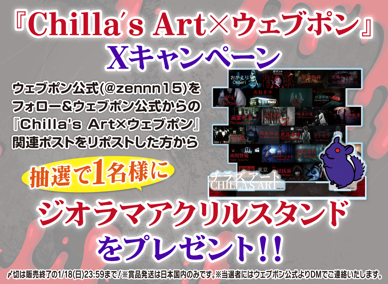 | 備考 | ★『Chilla's Art×ウェブポン』Xキャンペーン★ ウェブポン公式(@zennn15)をフォロー&ウェブポン公式からの『Chilla's Art×ウェブポン』関連ポストをリポストした方から抽選で1名様に【ジオラマアクリルスタンド】をプレゼント!!〆切は販売終了の1/18(日)23:59まで!※賞品発送は日本国内のみです。※当選者にはウェブポン公式よりDMでご連絡いたします。 |