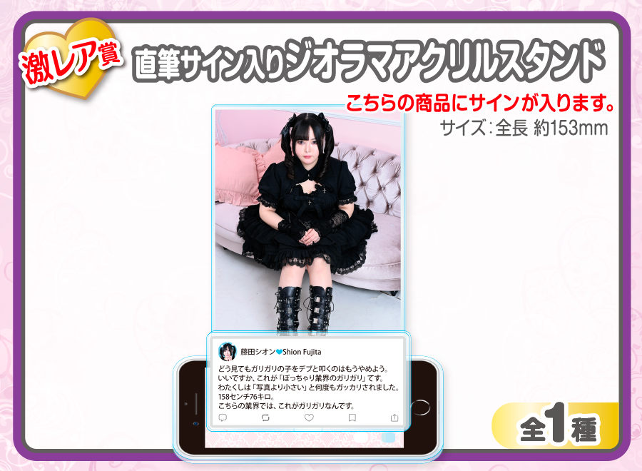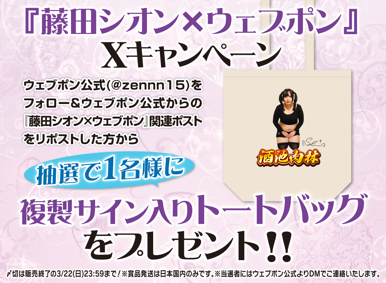 | 備考 | ★『藤田シオン×ウェブポン』Xキャンペーン★ ウェブポン公式(@zennn15)をフォロー&ウェブポン公式からの『藤田シオン×ウェブポン』関連ポストをリポストした方から抽選で1名様に【複製サイン入りトートバッグ】をプレゼント!!〆切は販売終了の3/22(日)23:59まで!※賞品発送は日本国内のみです。※当選者にはウェブポン公式よりDMでご連絡いたします。 |