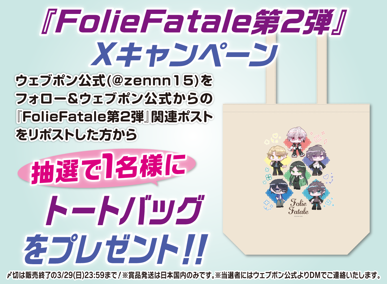 | 備考 | ★『FolieFatale第2弾』Xキャンペーン★ ウェブポン公式(@zennn15)をフォロー&ウェブポン公式からの『FolieFatale第2弾』関連ポストをリポストした方から抽選で1名様に【トートバッグ】をプレゼント!!〆切は販売終了の3/29(日)23:59まで!※賞品発送は日本国内のみです。※当選者にはウェブポン公式よりDMでご連絡いたします。 |
