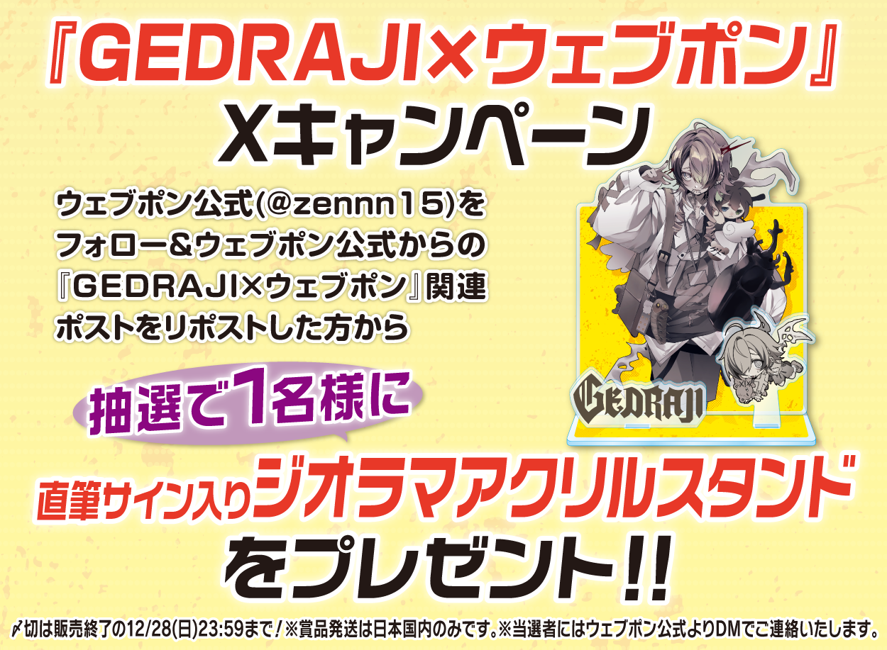 | 備考 | ★『GEDRAJI×ウェブポン』Xキャンペーン★ ウェブポン公式(@zennn15)をフォロー&ウェブポン公式からの『GEDRAJI×ウェブポン』関連ポストをリポストした方から抽選で1名様に【直筆サイン入りジオラマアクリルスタンド】をプレゼント!!〆切は販売終了の12/28(日)23:59まで!※賞品発送は日本国内のみです。※当選者にはウェブポン公式よりDMでご連絡いたします。 |