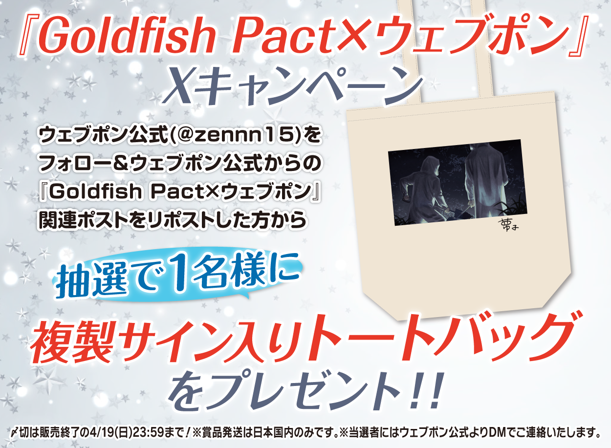 | 備考 | ★『Goldfish Pact×ウェブポン』Xキャンペーン★ ウェブポン公式(@zennn15)をフォロー&ウェブポン公式からの『Goldfish Pact×ウェブポン』関連ポストをリポストした方から抽選で1名様に【複製サイン入りトートバッグ】をプレゼント!!〆切は販売終了の4/19(日)23:59まで!※賞品発送は日本国内のみです。※当選者にはウェブポン公式よりDMでご連絡いたします。 |