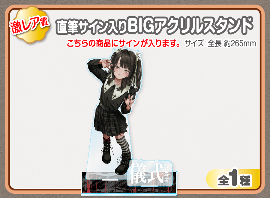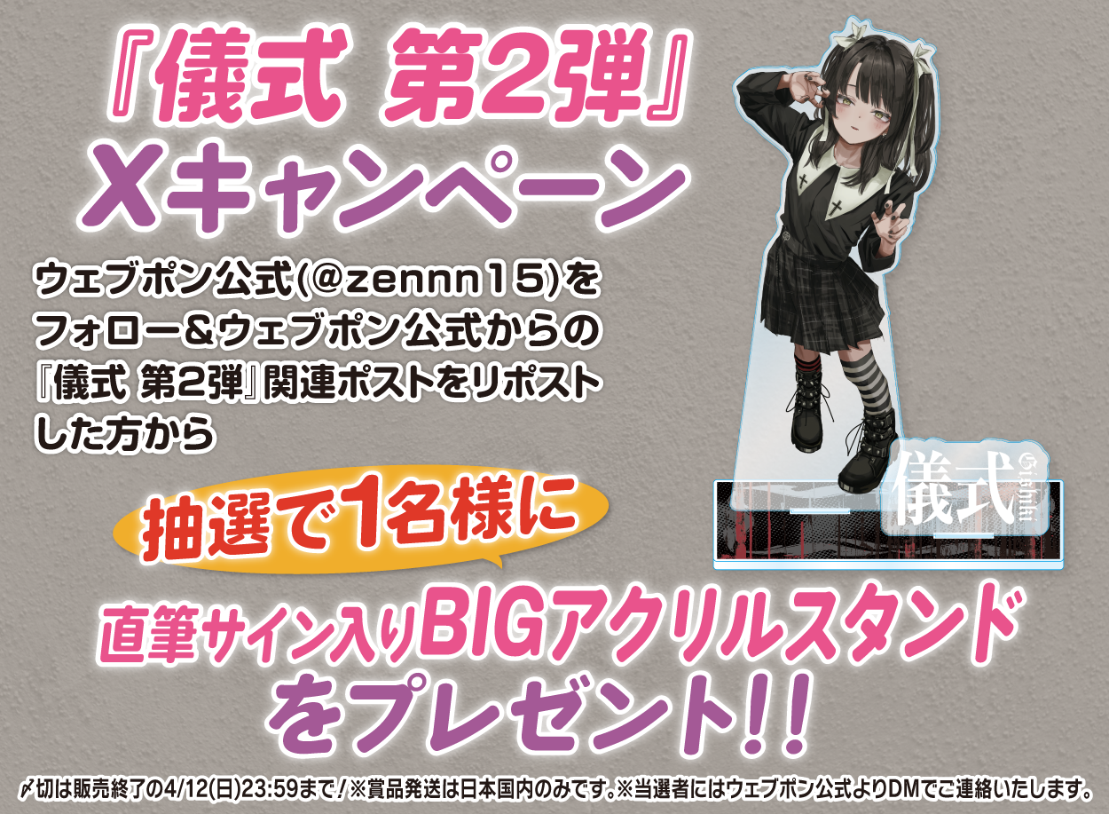 | 備考 | ★『儀式 第2弾』Xキャンペーン★ ウェブポン公式(@zennn15)をフォロー&ウェブポン公式からの『儀式 第2弾』関連ポストをリポストした方から抽選で1名様に【直筆サイン入りBIGアクリルスタンド】をプレゼント!!〆切は販売終了の4/12(日)23:59まで!※賞品発送は日本国内のみです。※当選者にはウェブポン公式よりDMでご連絡いたします。 |