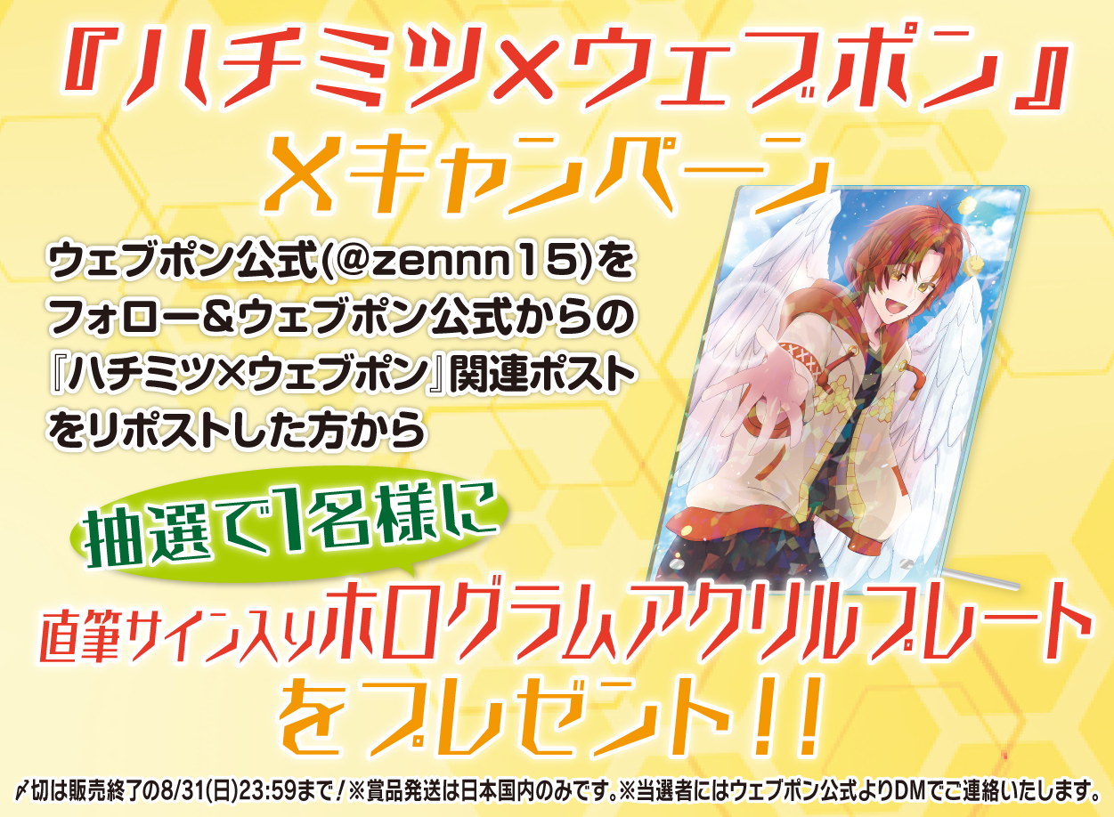 | 備考 | ★『ハチミツ×ウェブポン』Xキャンペーン★ ウェブポン公式(@zennn15)をフォロー&ウェブポン公式からの『ハチミツ×ウェブポン』関連ポストをリポストした方から抽選で1名様に【直筆サイン入りホログラムアクリルプレート】をプレゼント!!〆切は販売終了の8/31(日)23:59まで!※賞品発送は日本国内のみです。※当選者にはウェブポン公式よりDMでご連絡いたします。 |