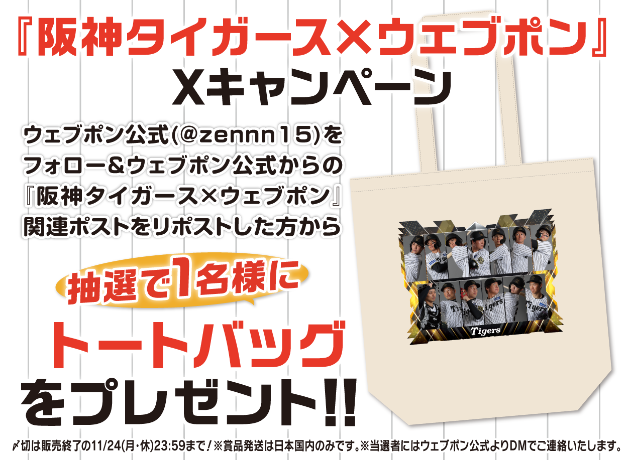 | 備考 | ★『阪神タイガース×ウェブポン』Xキャンペーン★ ウェブポン公式(@zennn15)をフォロー&ウェブポン公式からの『阪神タイガース×ウェブポン』関連ポストをリポストした方から抽選で1名様に【トートバッグ】をプレゼント!!〆切は販売終了の11/24(月・休)23:59まで!※賞品発送は日本国内のみです。※当選者にはウェブポン公式よりDMでご連絡いたします。 |