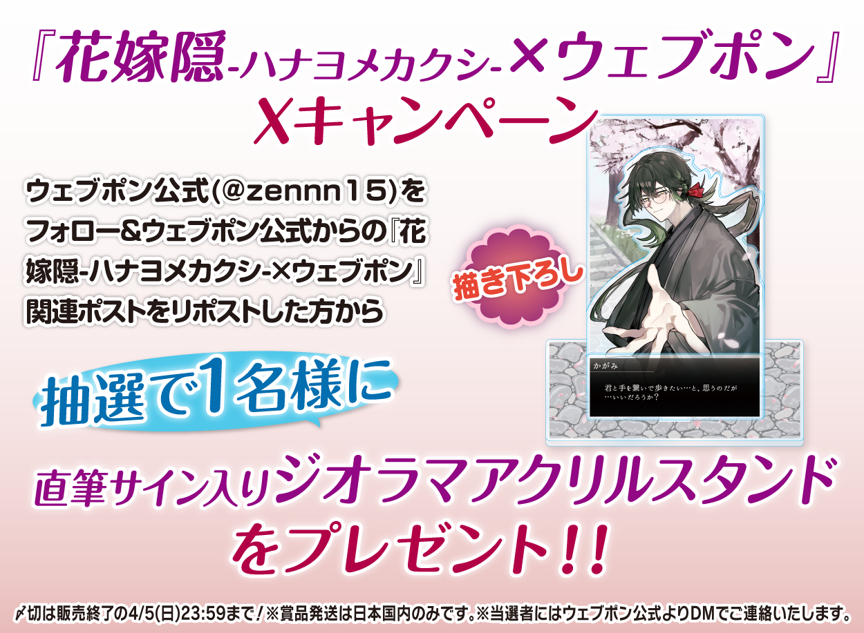 | 備考 | ★『花嫁隠-ハナヨメカクシ-×ウェブポン』Xキャンペーン★ ウェブポン公式(@zennn15)をフォロー&ウェブポン公式からの『花嫁隠-ハナヨメカクシ-×ウェブポン』関連ポストをリポストした方から抽選で1名様に【直筆サイン入りジオラマアクリルスタンド】をプレゼント!!〆切は販売終了の4/5(日)23:59まで!※賞品発送は日本国内のみです。※当選者にはウェブポン公式よりDMでご連絡いたします。 |