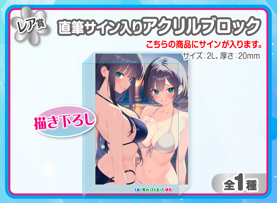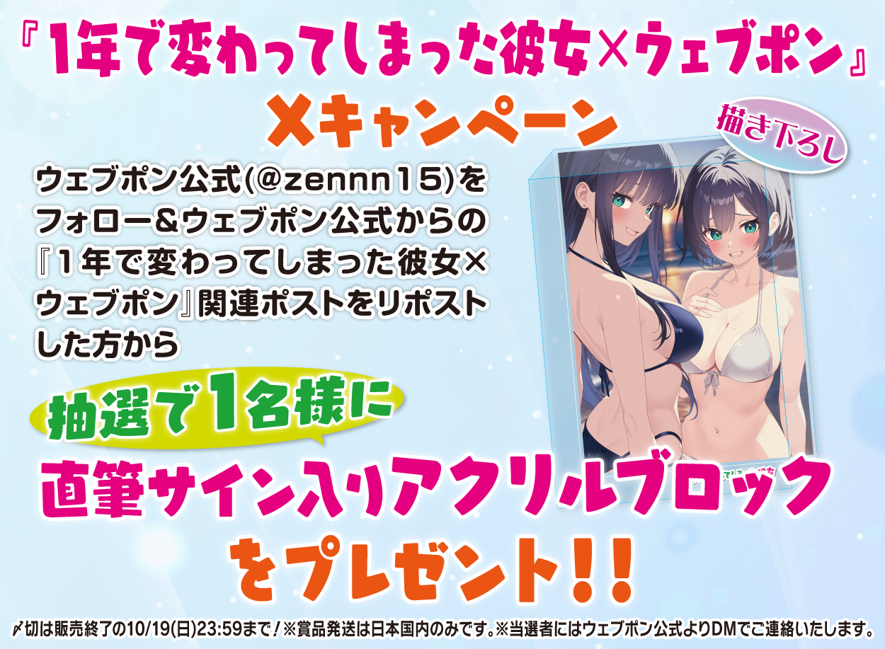 備考 | ★『1年で変わってしまった彼女×ウェブポン』Xキャンペーン★ ウェブポン公式(@zennn15)をフォロー&ウェブポン公式からの『1年で変わってしまった彼女×ウェブポン』関連ポストをリポストした方から抽選で1名様に【直筆サイン入りアクリルブロック】をプレゼント!!〆切は販売終了の10/19(日)23:59まで!※賞品発送は日本国内のみです。※当選者にはウェブポン公式よりDMでご連絡いたします。 |