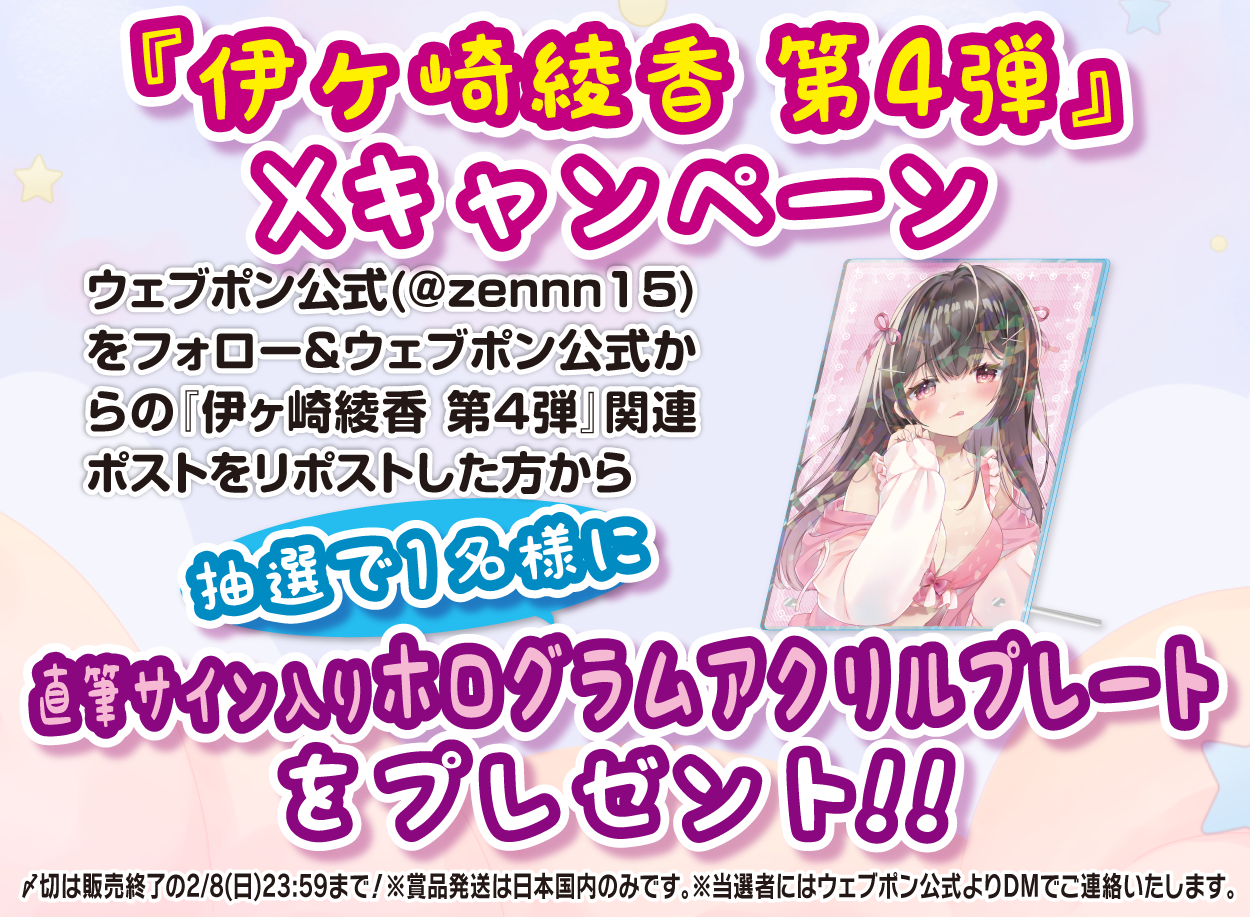 | 備考 | ★『伊ヶ崎綾香 第4弾』Xキャンペーン★ ウェブポン公式(@zennn15)をフォロー&ウェブポン公式からの『伊ヶ崎綾香 第4弾』関連ポストをリポストした方から抽選で1名様に【直筆サイン入りホログラムアクリルプレート】をプレゼント!!〆切は販売終了の2/8(日)23:59まで!※賞品発送は日本国内のみです。※当選者にはウェブポン公式よりDMでご連絡いたします。 |