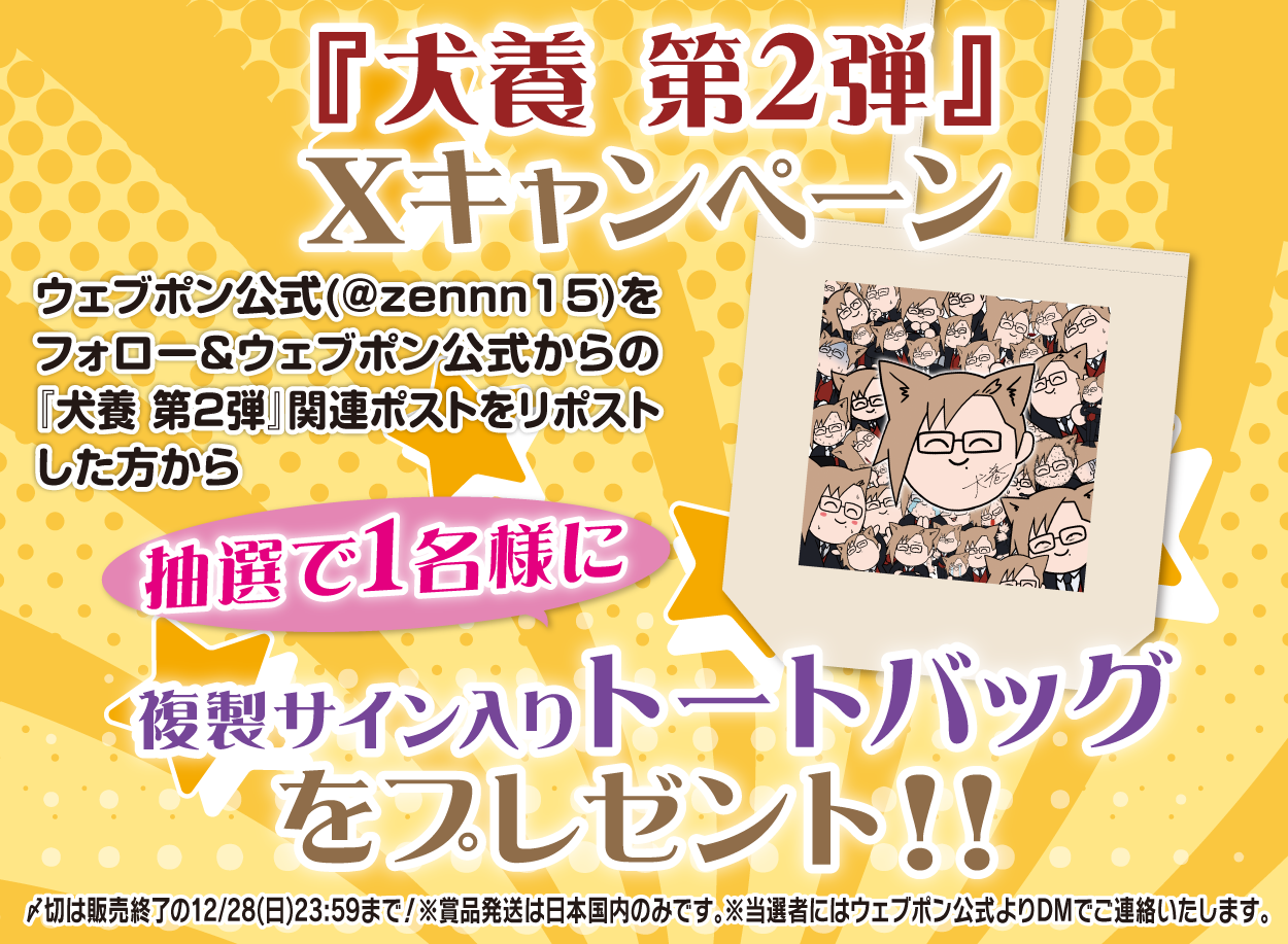 | 備考 | ★『犬養 第2弾』Xキャンペーン★ ウェブポン公式(@zennn15)をフォロー&ウェブポン公式からの『犬養 第2弾』関連ポストをリポストした方から抽選で1名様に【複製サイン入りトートバッグ】をプレゼント!!〆切は販売終了の12/28(日)23:59まで!※賞品発送は日本国内のみです。※当選者にはウェブポン公式よりDMでご連絡いたします。 |