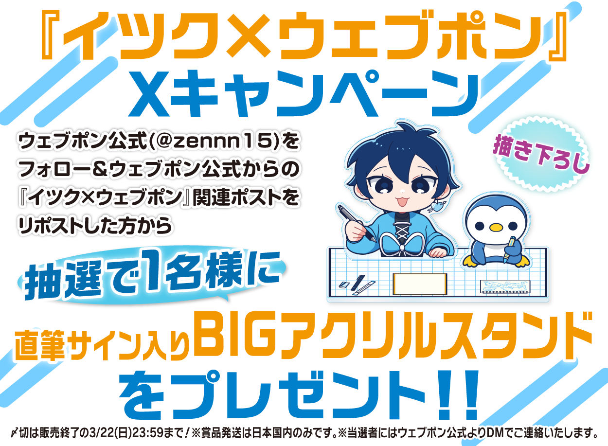 | 備考 | ★『イツク×ウェブポン』Xキャンペーン★ ウェブポン公式(@zennn15)をフォロー&ウェブポン公式からの『イツク×ウェブポン』関連ポストをリポストした方から抽選で1名様に【直筆サイン入りBIGアクリルスタンド】をプレゼント!!〆切は販売終了の3/22(日)23:59まで!※賞品発送は日本国内のみです。※当選者にはウェブポン公式よりDMでご連絡いたします。 |