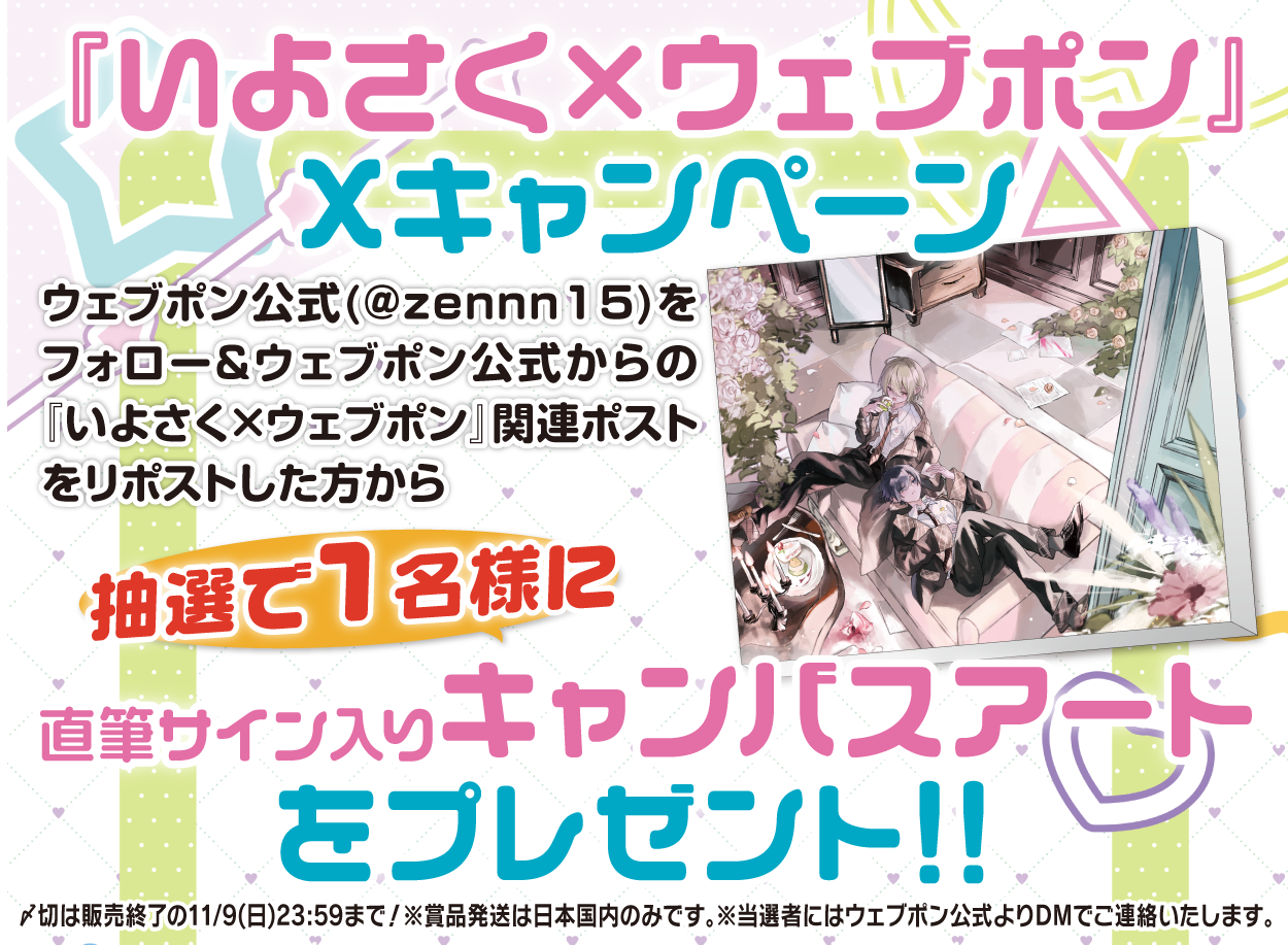 | 備考 | ★『いよさく×ウェブポン』Xキャンペーン★ ウェブポン公式(@zennn15)をフォロー&ウェブポン公式からの『いよさく×ウェブポン』関連ポストをリポストした方から抽選で1名様に【直筆サイン入りキャンバスアート】をプレゼント!!〆切は販売終了の11/9(日)23:59まで!※賞品発送は日本国内のみです。※当選者にはウェブポン公式よりDMでご連絡いたします。  |