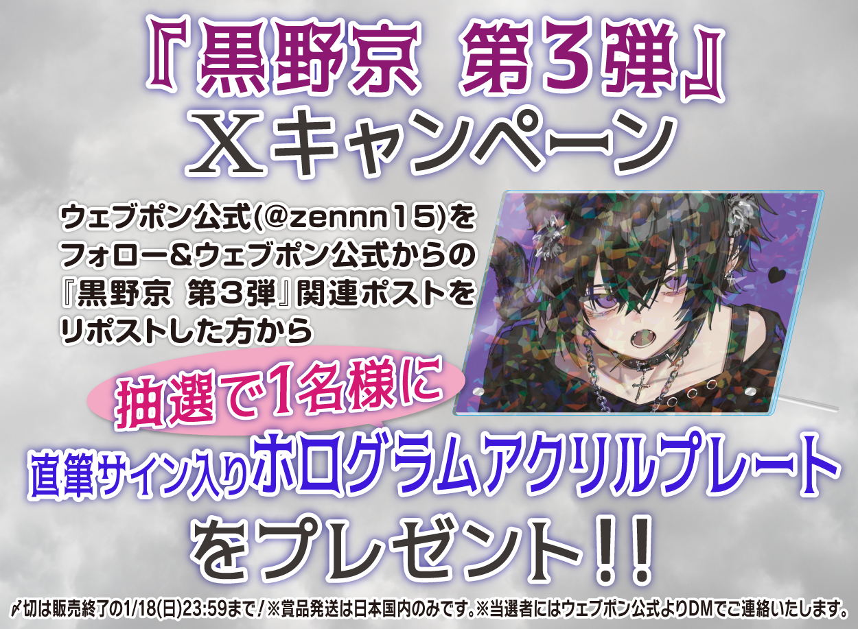 | 備考 | ★『黒野京 第3弾』Xキャンペーン★ ウェブポン公式(@zennn15)をフォロー&ウェブポン公式からの『黒野京 第3弾』関連ポストをリポストした方から抽選で1名様に【直筆サイン入りホログラムアクリルプレート】をプレゼント!!〆切は販売終了の1/18(日)23:59まで!※賞品発送は日本国内のみです。※当選者にはウェブポン公式よりDMでご連絡いたします。 |