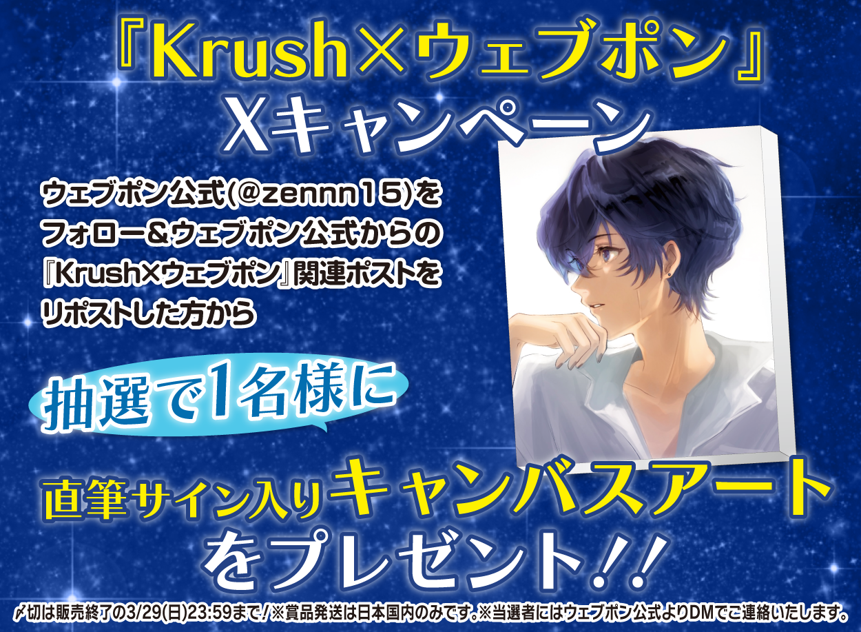 | 備考 | ★『Krush×ウェブポン』Xキャンペーン★ ウェブポン公式(@zennn15)をフォロー&ウェブポン公式からの『Krush×ウェブポン』関連ポストをリポストした方から抽選で1名様に【直筆サイン入りキャンバスボード】をプレゼント!!〆切は販売終了の3/29(日)23:59まで!※賞品発送は日本国内のみです。※当選者にはウェブポン公式よりDMでご連絡いたします。 ▼激レア賞当選者には3/30(月)に別途メールいたします。 3/31(火)までにメッセージ内で呼んで頂きたい名前を必ずご返信ください。 ご返信がない場合は登録氏名に基づきメッセージ作成しますので予めご了承ください。 ※事前に『webpon@zenco.co.jp』の受信設定をお願いします。メールの再送は致しかねますので予めご了承ください。 ※メール未着の方は3/31(火)12:00までに『購入タイトル/当選数/登録氏名/呼ばれたい名前(+フリガナ)』を記載しウェブポン公式X(@zennn15)のDMからご連絡ください。 |