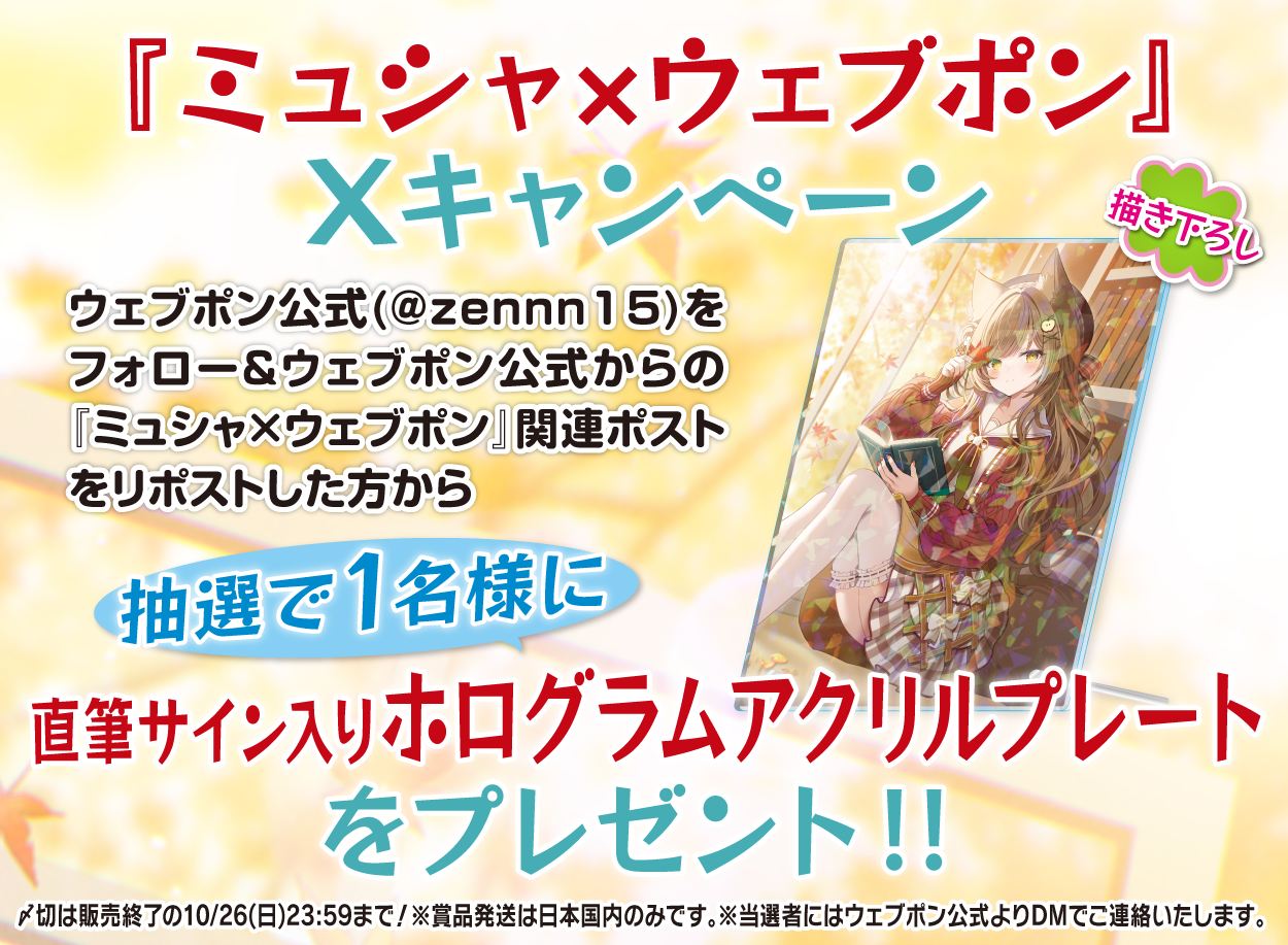 | 備考 | ★『ミュシャ×ウェブポン』Xキャンペーン★ ウェブポン公式(@zennn15)をフォロー&ウェブポン公式からの『ミュシャ×ウェブポン』関連ポストをリポストした方から抽選で1名様に【直筆サイン入りホログラムアクリルプレート】をプレゼント!!〆切は販売終了の10/26(日)23:59まで!※賞品発送は日本国内のみです。※当選者にはウェブポン公式よりDMでご連絡いたします。 |