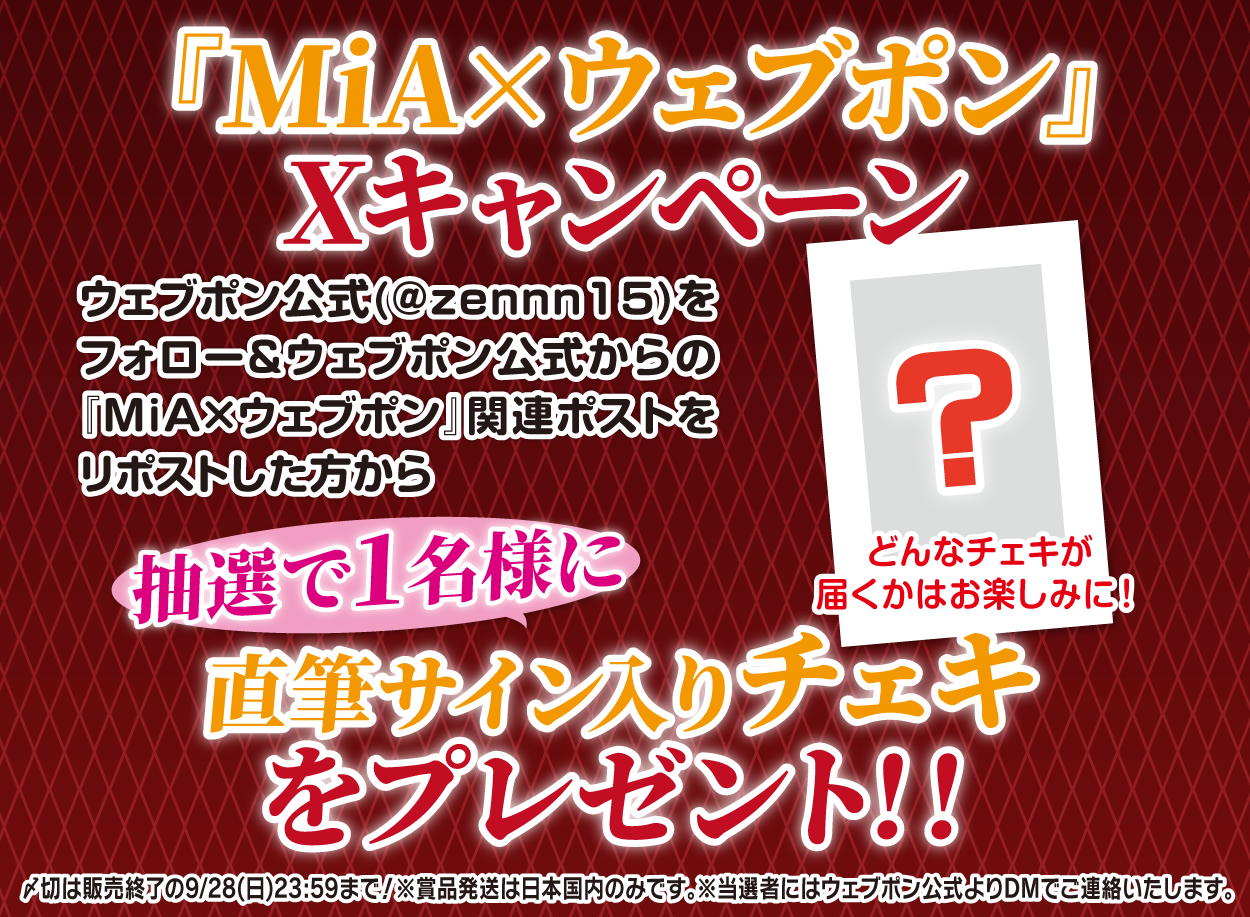 | 備考 | ★『MiA×ウェブポン』Xキャンペーン★ ウェブポン公式(@zennn15)をフォロー&ウェブポン公式からの『MiA×ウェブポン』関連ポストをリポストした方から抽選で1名様に【直筆サイン入りチェキ】をプレゼント!!〆切は販売終了の9/28(日)23:59まで!※賞品発送は日本国内のみです。※当選者にはウェブポン公式よりDMでご連絡いたします。 ▼激レア賞・レア賞当選者には9/29(月)に別途メールいたします。 10/1(水)までにメッセージ内で呼んで頂きたい名前を必ずご返信ください。 ご返信がない場合は登録氏名に基づきメッセージ作成しますので予めご了承ください。 ※事前に『webpon@zenco.co.jp』の受信設定をお願いします。メールの再送は致しかねますので予めご了承ください。 ※メール未着の方は10/1(水)12:00までに『購入タイトル/当選した賞/当選数/登録氏名/呼ばれたい名前(+フリガナ)』を記載しウェブポン公式X(@zennn15)のDMからご連絡ください。 |