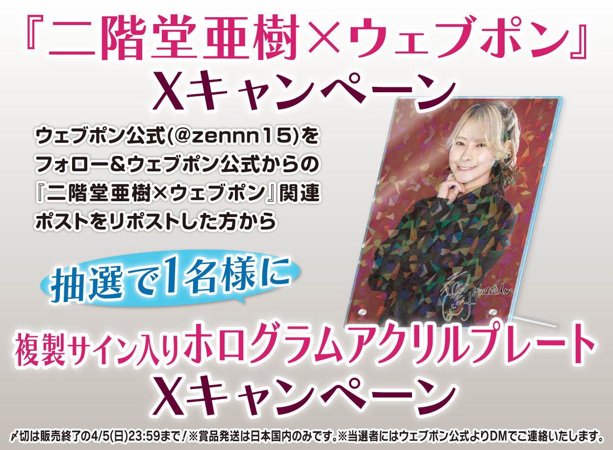 | 備考 | ★『二階堂亜樹×ウェブポン』Xキャンペーン★ ウェブポン公式(@zennn15)をフォロー&ウェブポン公式からの『二階堂亜樹×ウェブポン』関連ポストをリポストした方から抽選で1名様に【複製サイン入りホログラムアクリルプレート】をプレゼント!!〆切は販売終了の4/5(日)23:59まで!※賞品発送は日本国内のみです。※当選者にはウェブポン公式よりDMでご連絡いたします。 |