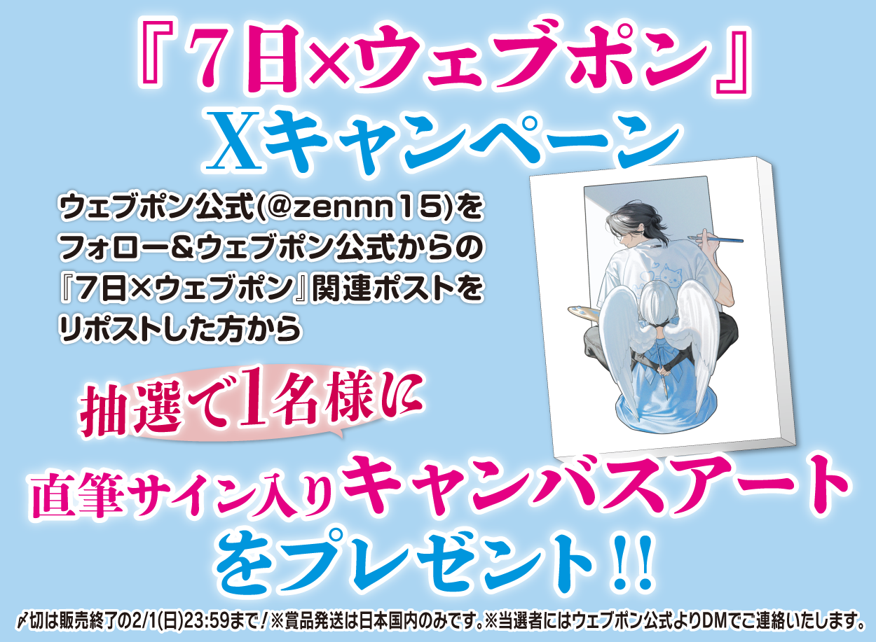 | 備考 | ★『7日×ウェブポン』Xキャンペーン★ ウェブポン公式(@zennn15)をフォロー&ウェブポン公式からの『7日×ウェブポン』関連ポストをリポストした方から抽選で1名様に【直筆サイン入りキャンバスアート】をプレゼント!!〆切は販売終了の2/1(日)23:59まで!※賞品発送は日本国内のみです。※当選者にはウェブポン公式よりDMでご連絡いたします。 |