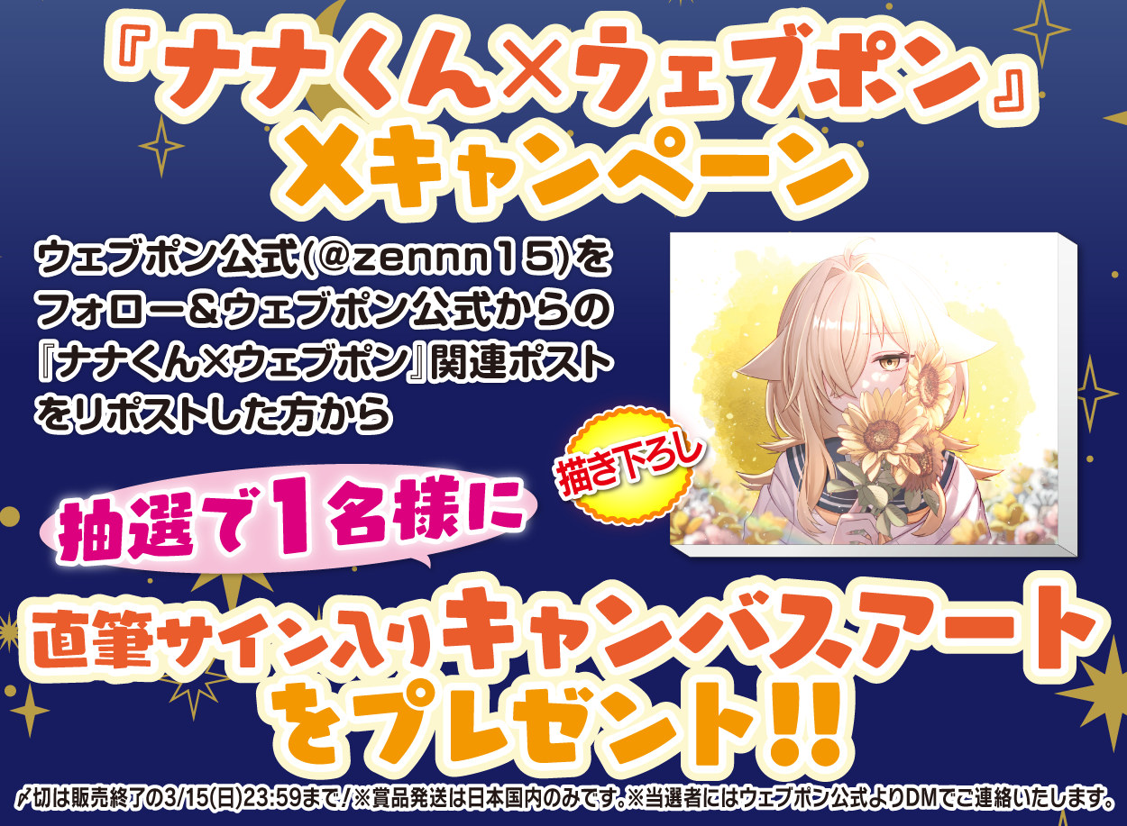 | 備考 | ★『ナナくん×ウェブポン』Xキャンペーン★ ウェブポン公式(@zennn15)をフォロー&ウェブポン公式からの『ナナくん×ウェブポン』関連ポストをリポストした方から抽選で1名様に【直筆サイン入りキャンバスアート】をプレゼント!!〆切は販売終了の3/15(日)23:59まで!※賞品発送は日本国内のみです。※当選者にはウェブポン公式よりDMでご連絡いたします。 |