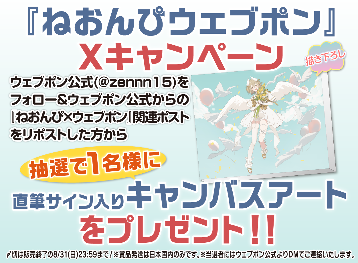 | 備考 | ★『ねおんぴウェブポン』Xキャンペーン★ ウェブポン公式(@zennn15)をフォロー&ウェブポン公式からの『ねおんぴ×ウェブポン』関連ポストをリポストした方から抽選で1名様に【直筆サイン入りキャンバスアート】をプレゼント!!〆切は販売終了の8/31(日)23:59まで!※賞品発送は日本国内のみです。※当選者にはウェブポン公式よりDMでご連絡いたします。 |