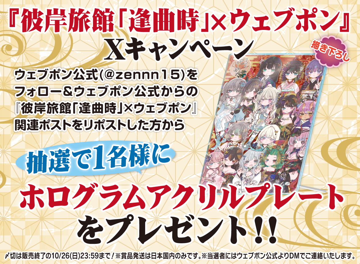 | 備考 | ★『彼岸旅館「逢曲時」×ウェブポン』Xキャンペーン★ ウェブポン公式(@zennn15)をフォロー&ウェブポン公式からの『彼岸旅館「逢曲時」×ウェブポン』関連ポストをリポストした方から抽選で1名様に【ホログラムアクリルプレート】をプレゼント!!〆切は販売終了の10/26(日)23:59まで!※賞品発送は日本国内のみです。※当選者にはウェブポン公式よりDMでご連絡いたします。 |
