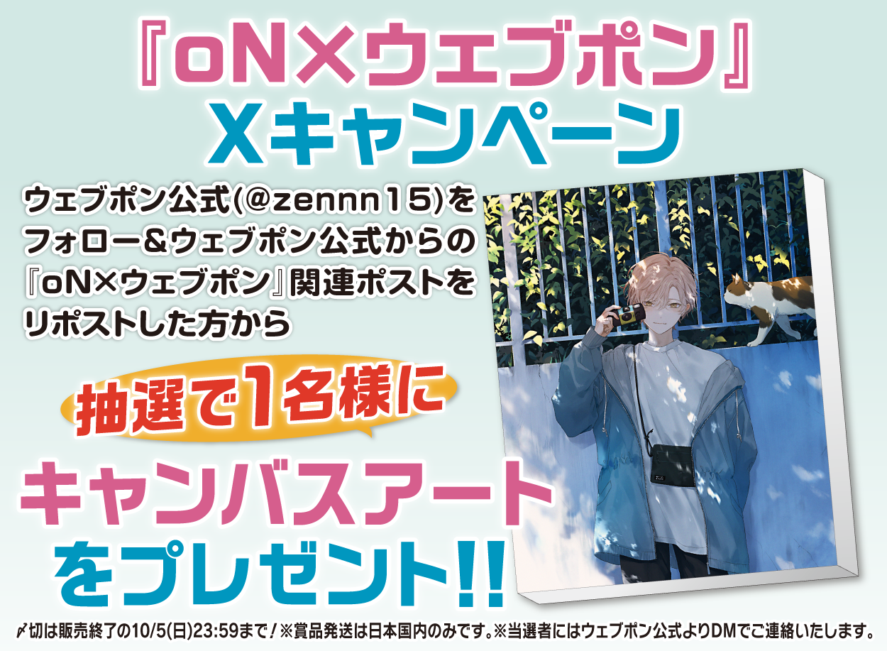 | 備考 | ★『oN×ウェブポン』Xキャンペーン★ ウェブポン公式(@zennn15)をフォロー&ウェブポン公式からの『oN×ウェブポン』関連ポストをリポストした方から抽選で1名様に【キャンバスアート】をプレゼント!!〆切は販売終了の10/5(日)23:59まで!※賞品発送は日本国内のみです。※当選者にはウェブポン公式よりDMでご連絡いたします。 |