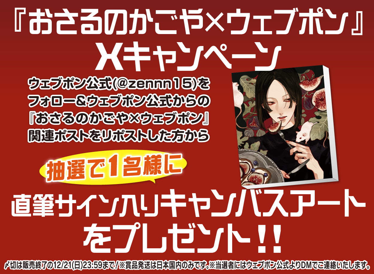 | 備考 | ★『おさるのかごや×ウェブポン』Xキャンペーン★ ウェブポン公式(@zennn15)をフォロー&ウェブポン公式からの『おさるのかごや×ウェブポン』関連ポストをリポストした方から抽選で1名様に【直筆サイン入りキャンバスアート】をプレゼント!!〆切は販売終了の12/21(日)23:59まで!※賞品発送は日本国内のみです。※当選者にはウェブポン公式よりDMでご連絡いたします。 |