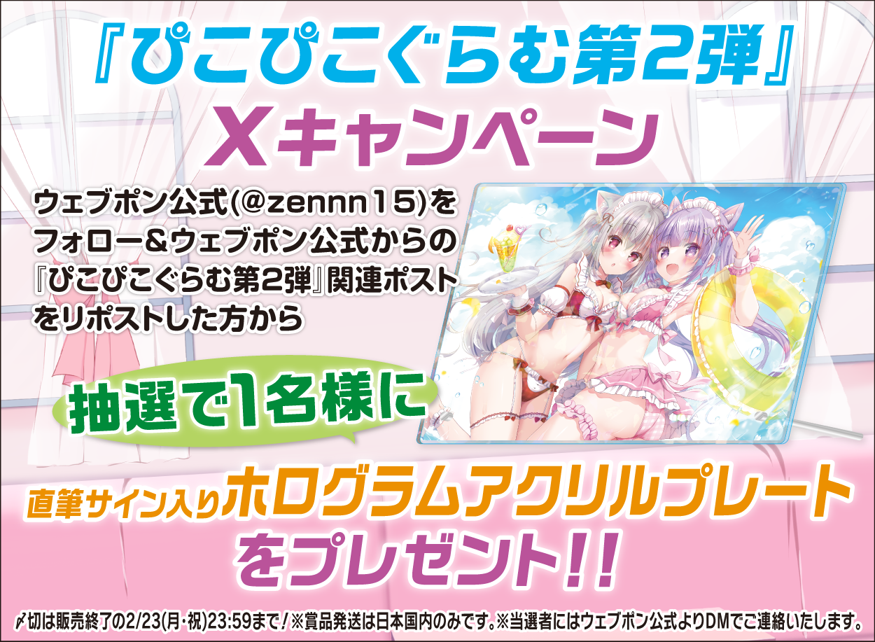 | 備考 | ★『ぴこぴこぐらむ第2弾』Xキャンペーン★ ウェブポン公式(@zennn15)をフォロー&ウェブポン公式からの『ぴこぴこぐらむ第2弾』関連ポストをリポストした方から抽選で1名様に【直筆サイン入りホログラムアクリルプレート】をプレゼント!!〆切は販売終了の2/23(月・祝)23:59まで!※賞品発送は日本国内のみです。※当選者にはウェブポン公式よりDMでご連絡いたします。 |