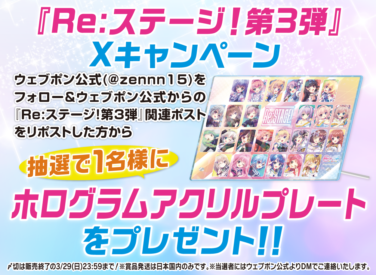 | 備考 | ★『Re:ステージ!第3弾』Xキャンペーン★ ウェブポン公式(@zennn15)をフォロー&ウェブポン公式からの『Re:ステージ!第3弾』関連ポストをリポストした方から抽選で1名様に【ホログラムアクリルプレート】をプレゼント!!〆切は販売終了の3/29(日)23:59まで!※賞品発送は日本国内のみです。※当選者にはウェブポン公式よりDMでご連絡いたします。 |