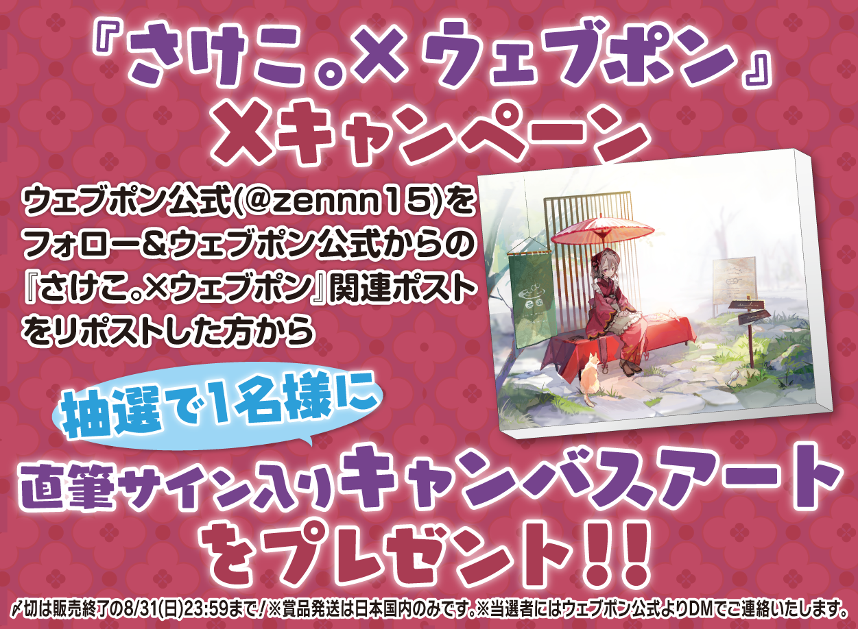 | 備考 | ★『さけこ。×ウェブポン』Xキャンペーン★ ウェブポン公式(@zennn15)をフォロー&ウェブポン公式からの『さけこ。×ウェブポン』関連ポストをリポストした方から抽選で1名様に【直筆サイン入りキャンバスアート】をプレゼント!!〆切は販売終了の8/31(日)23:59まで!※賞品発送は日本国内のみです。※当選者にはウェブポン公式よりDMでご連絡いたします。 |