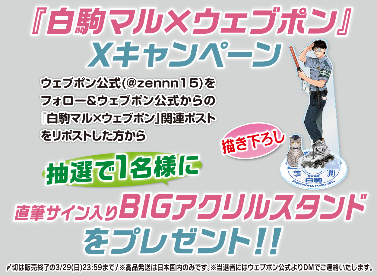 | 備考 | ★『白駒マル×ウェブポン』Xキャンペーン★ ウェブポン公式(@zennn15)をフォロー&ウェブポン公式からの『白駒マル×ウェブポン』関連ポストをリポストした方から抽選で1名様に【直筆サイン入りBIGアクリルスタンド】をプレゼント!!〆切は販売終了の3/29(日)23:59まで!※賞品発送は日本国内のみです。※当選者にはウェブポン公式よりDMでご連絡いたします。 |