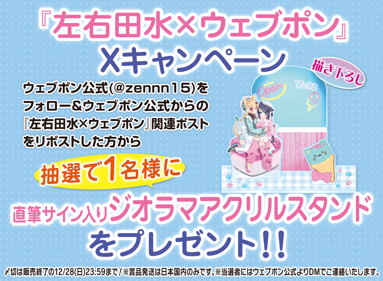 | 備考 | ★『左右田水×ウェブポン』Xキャンペーン★ ウェブポン公式(@zennn15)をフォロー&ウェブポン公式からの『左右田水×ウェブポン』関連ポストをリポストした方から抽選で1名様に【直筆サイン入りジオラマアクリルスタンド】をプレゼント!!〆切は販売終了の12/28(日)23:59まで!※賞品発送は日本国内のみです。※当選者にはウェブポン公式よりDMでご連絡いたします。 |