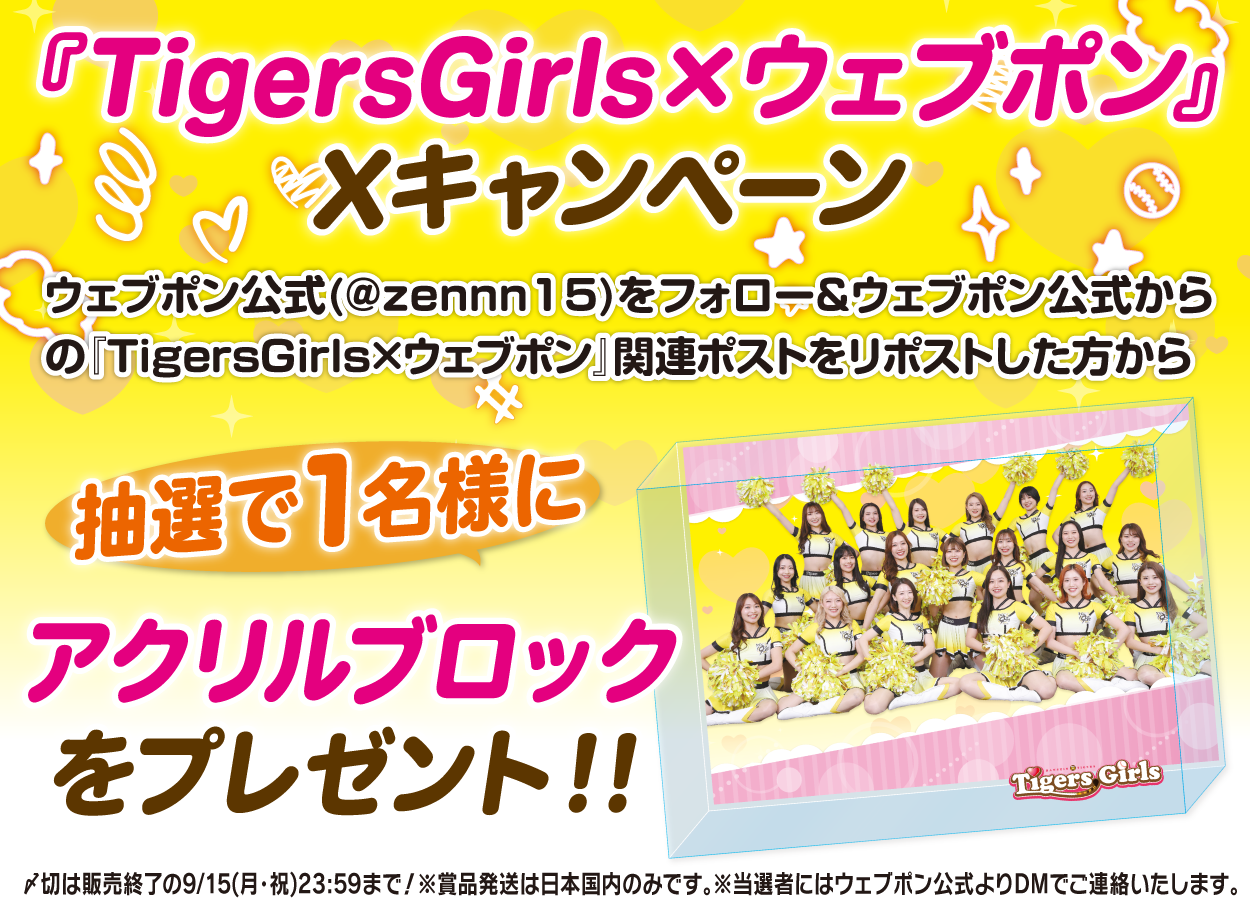 | 備考 | ★『TigersGirls×ウェブポン』Xキャンペーン★ ウェブポン公式(@zennn15)をフォロー&ウェブポン公式からの『TigersGirls×ウェブポン』関連ポストをリポストした方から抽選で1名様に【アクリルブロック】をプレゼント!!〆切は販売終了の9/15(月・祝)23:59まで!※賞品発送は日本国内のみです。※当選者にはウェブポン公式よりDMでご連絡いたします。 |