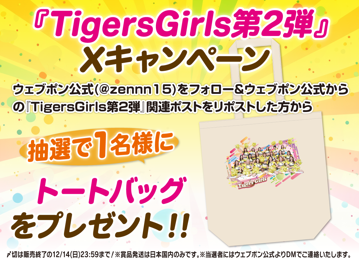 | 備考 | ★『TigersGirls第2弾』Xキャンペーン★ ウェブポン公式(@zennn15)をフォロー&ウェブポン公式からの『TigersGirls第2弾』関連ポストをリポストした方から抽選で1名様に【トートバッグ】をプレゼント!!〆切は販売終了の12/14(日)23:59まで!※賞品発送は日本国内のみです。※当選者にはウェブポン公式よりDMでご連絡いたします。 |