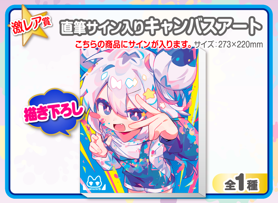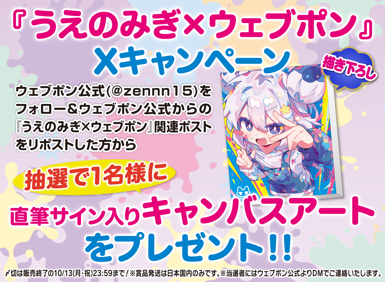 備考 | ★『うえのみぎ×ウェブポン』Xキャンペーン★ ウェブポン公式(@zennn15)をフォロー&ウェブポン公式からの『うえのみぎ×ウェブポン』関連ポストをリポストした方から抽選で1名様に【直筆サイン入りキャンバスアート】をプレゼント!!〆切は販売終了の10/13(月・祝)23:59まで!※賞品発送は日本国内のみです。※当選者にはウェブポン公式よりDMでご連絡いたします。 |