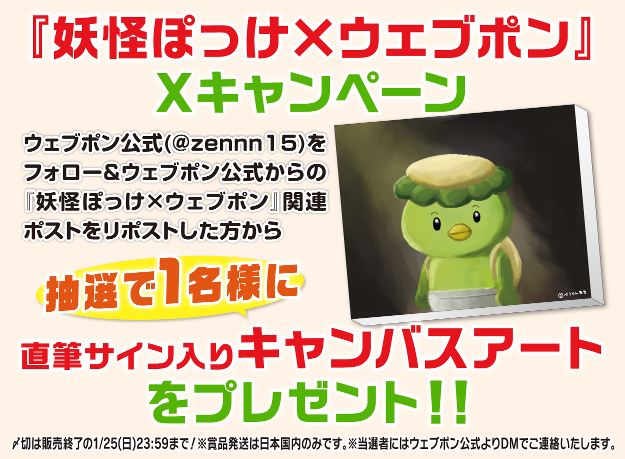 | 備考 | ★『妖怪ぽっけ×ウェブポン』Xキャンペーン★ ウェブポン公式(@zennn15)をフォロー&ウェブポン公式からの『妖怪ぽっけ×ウェブポン』関連ポストをリポストした方から抽選で1名様に【直筆サイン入りキャンバスアート】をプレゼント!!〆切は販売終了の1/25(日)23:59まで!※賞品発送は日本国内のみです。※当選者にはウェブポン公式よりDMでご連絡いたします。 |