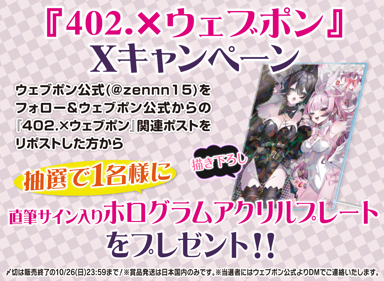 | 備考 | ★『402.×ウェブポン』Xキャンペーン★ ウェブポン公式(@zennn15)をフォロー&ウェブポン公式からの『402.×ウェブポン』関連ポストをリポストした方から抽選で1名様に【直筆サイン入りホログラムアクリルプレート】をプレゼント!!〆切は販売終了の10/26(日)23:59まで!※賞品発送は日本国内のみです。※当選者にはウェブポン公式よりDMでご連絡いたします。 |