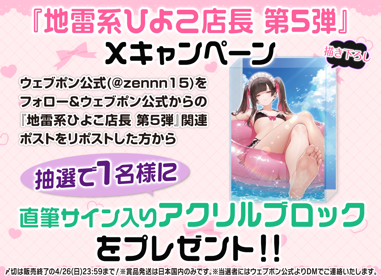 | 備考 | ★『地雷系ひよこ店長 第5弾』Xキャンペーン★ ウェブポン公式(@zennn15)をフォロー&ウェブポン公式からの『地雷系ひよこ店長 第5弾』関連ポストをリポストした方から抽選で1名様に【直筆サイン入りアクリルブロック 】をプレゼント!!〆切は販売終了の4/26(日)23:59まで!※賞品発送は日本国内のみです。※当選者にはウェブポン公式よりDMでご連絡いたします。 |