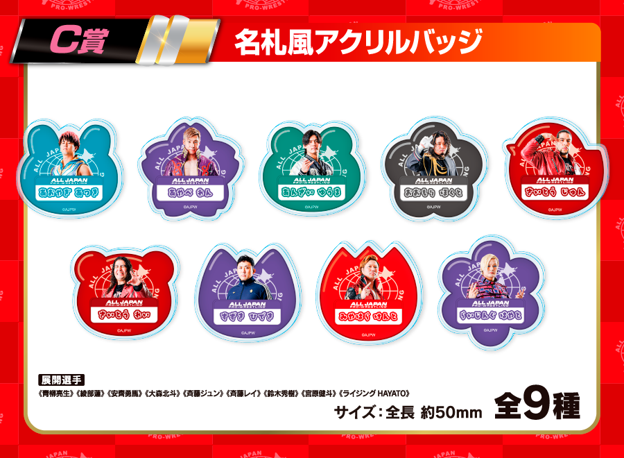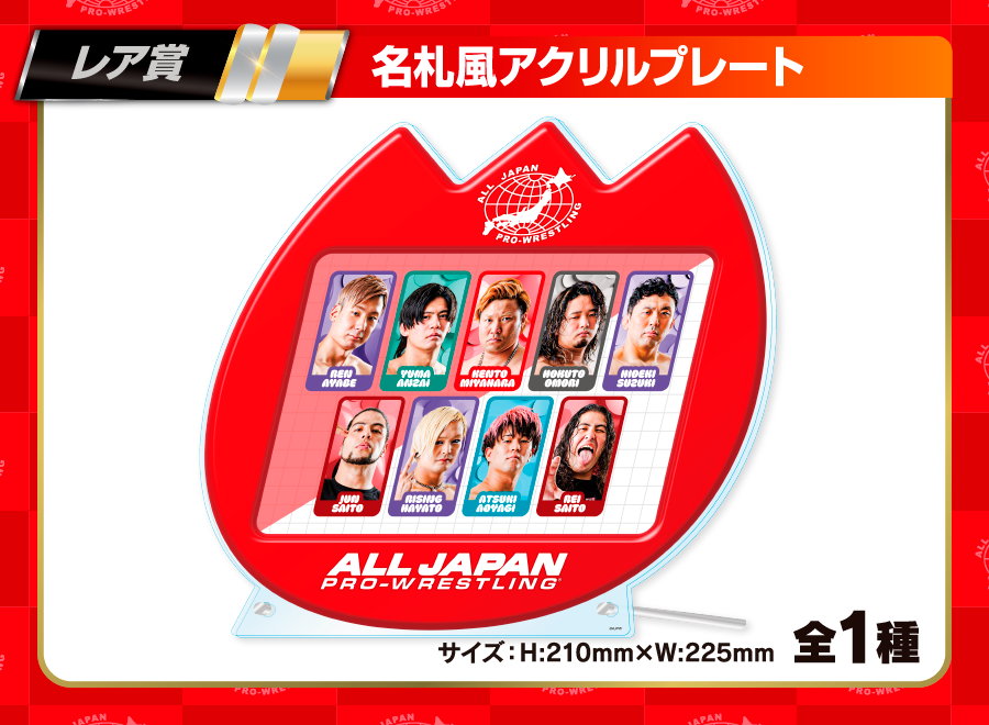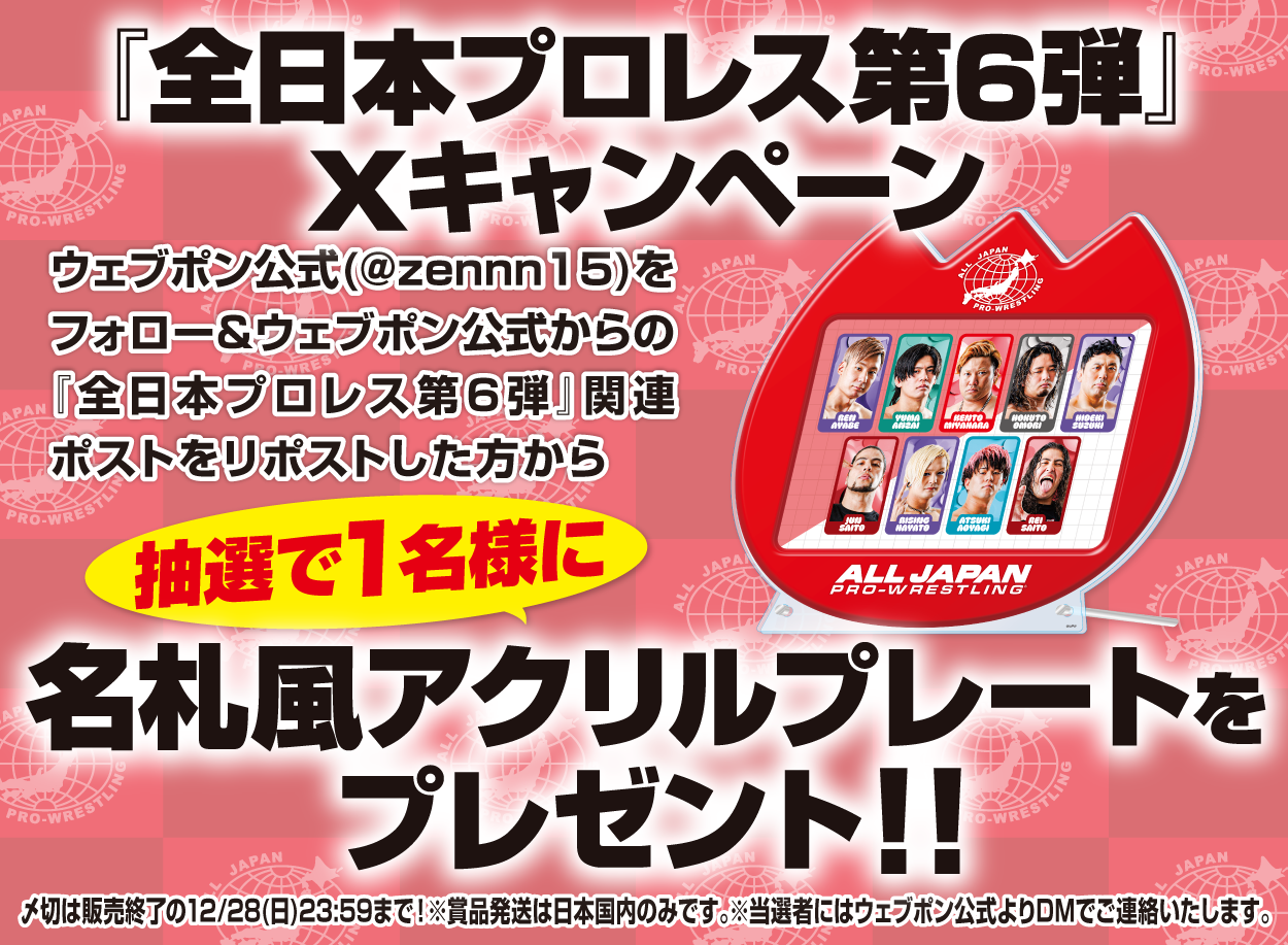 | 備考 | ★『全日本プロレス第6弾』Xキャンペーン★ ウェブポン公式(@zennn15)をフォロー&ウェブポン公式からの『全日本プロレス第6弾』関連ポストをリポストした方から抽選で1名様に【名札風アクリルプレート】をプレゼント!!〆切は販売終了の12/28(日)23:59まで!※賞品発送は日本国内のみです。※当選者にはウェブポン公式よりDMでご連絡いたします。 2025年7月24日時点のコスチュームとなります。 |